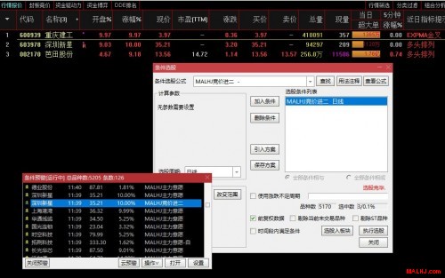 市场在不停的变化,万变不离其中,我们MALHJ系列公式也进行了不停优化和总结,现在已经适应所有通过信版本及券商版的均可以使用,它的功能更全面,界面更简结,方法更简单。可以预警,可以选股,可以排序,支持竞价一进二,支持拉升意愿预警等,不需要绑定DLL文件。